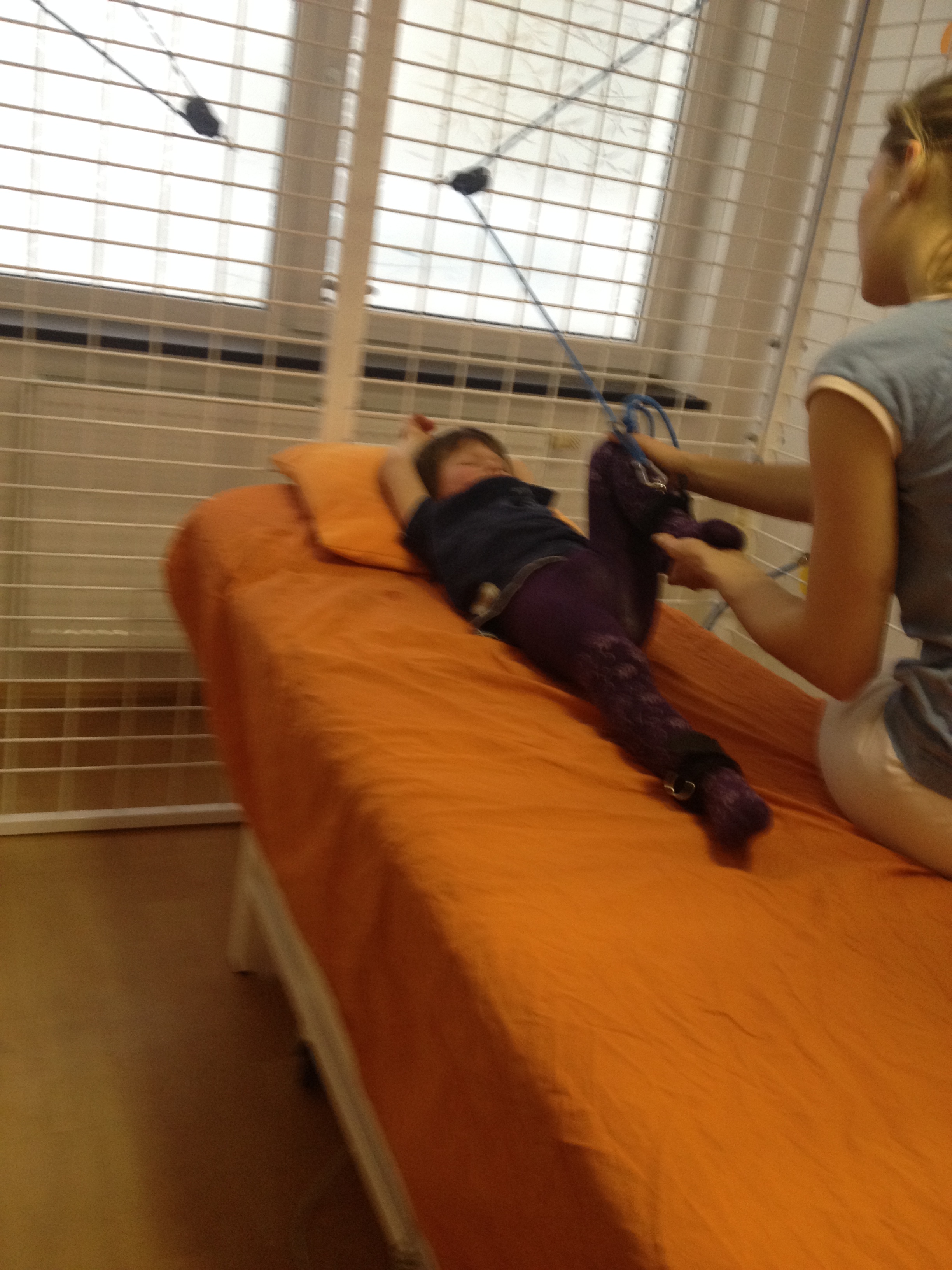 procvičování s ortézami, Jáchymka to nebolí, ale vzteká se, protože nechce cvičit